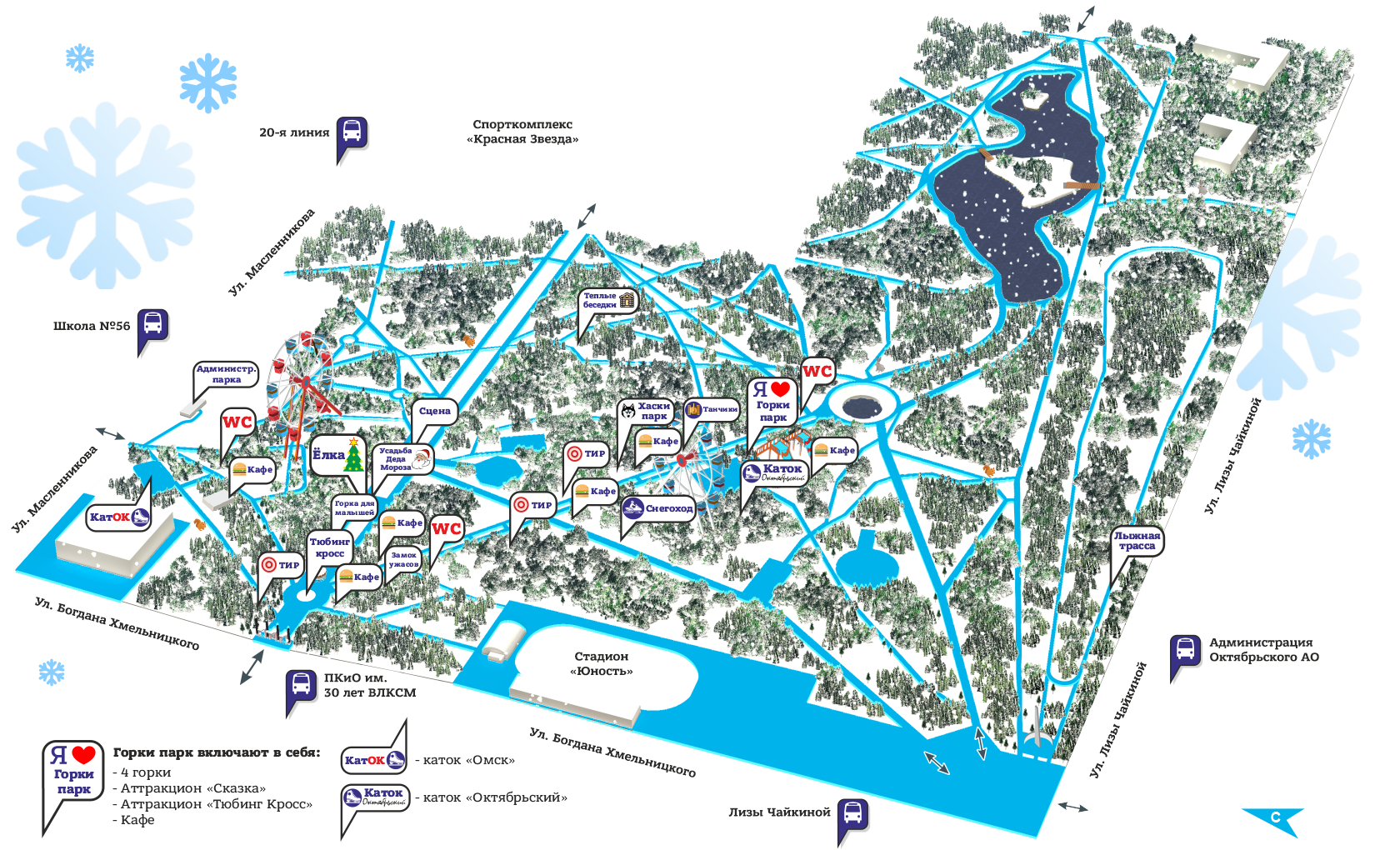 В состав МП г. Омска «Парк культуры и отдыха им. 30-летия ВЛКСМ» входят 4 парка: головное предприятие - 73,8 га и его обособленные подразделения: парк «Советский» - 30,3 га, Сад «Сибирь» - 6,9 га, Сад им. С.М. Кирова - 1,5 га. Общая площадь территорий составляет 112,5 га.