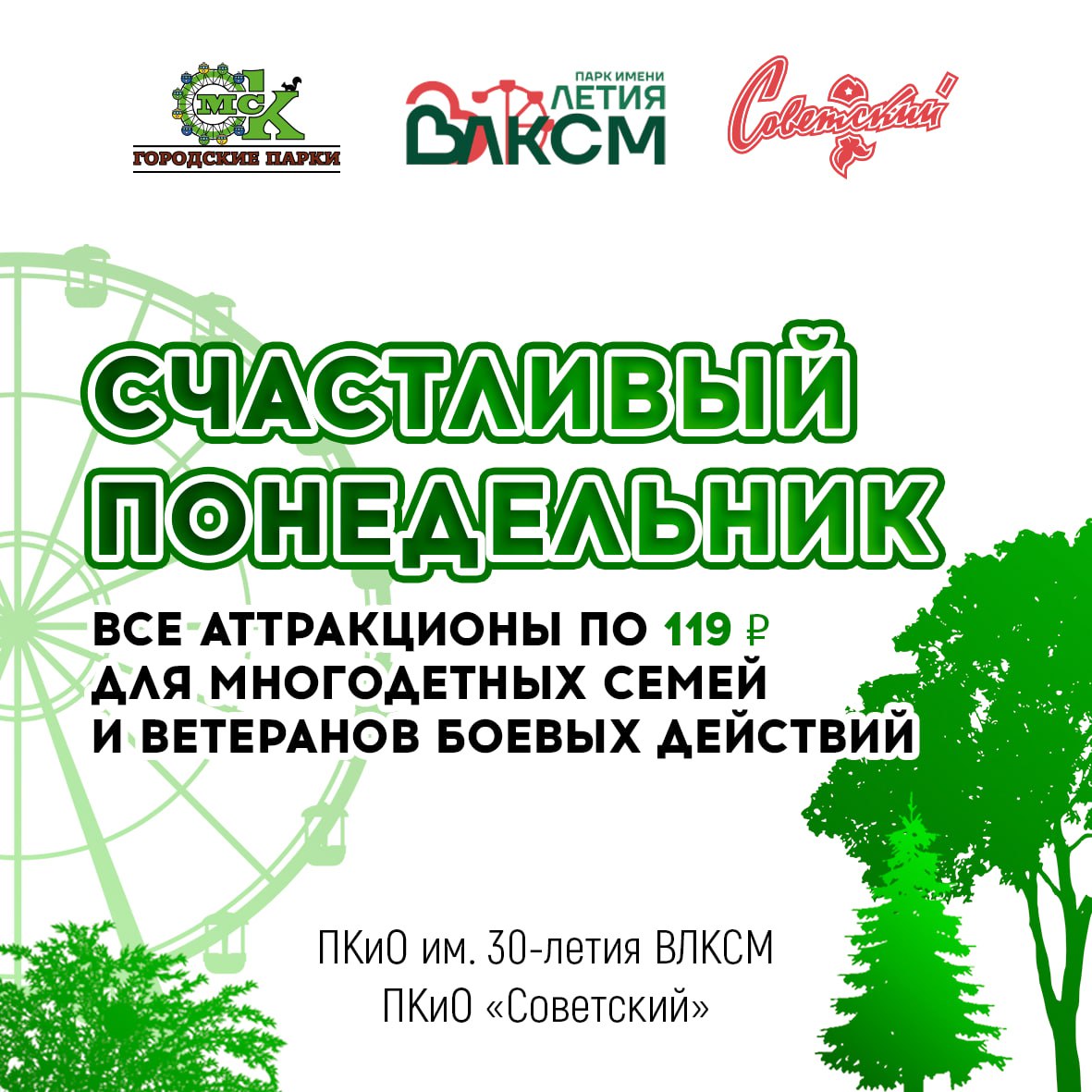 Каждый понедельник в парках им. 30-летия ВЛКСМ и Советском парке действует специальное предложение! 🎉